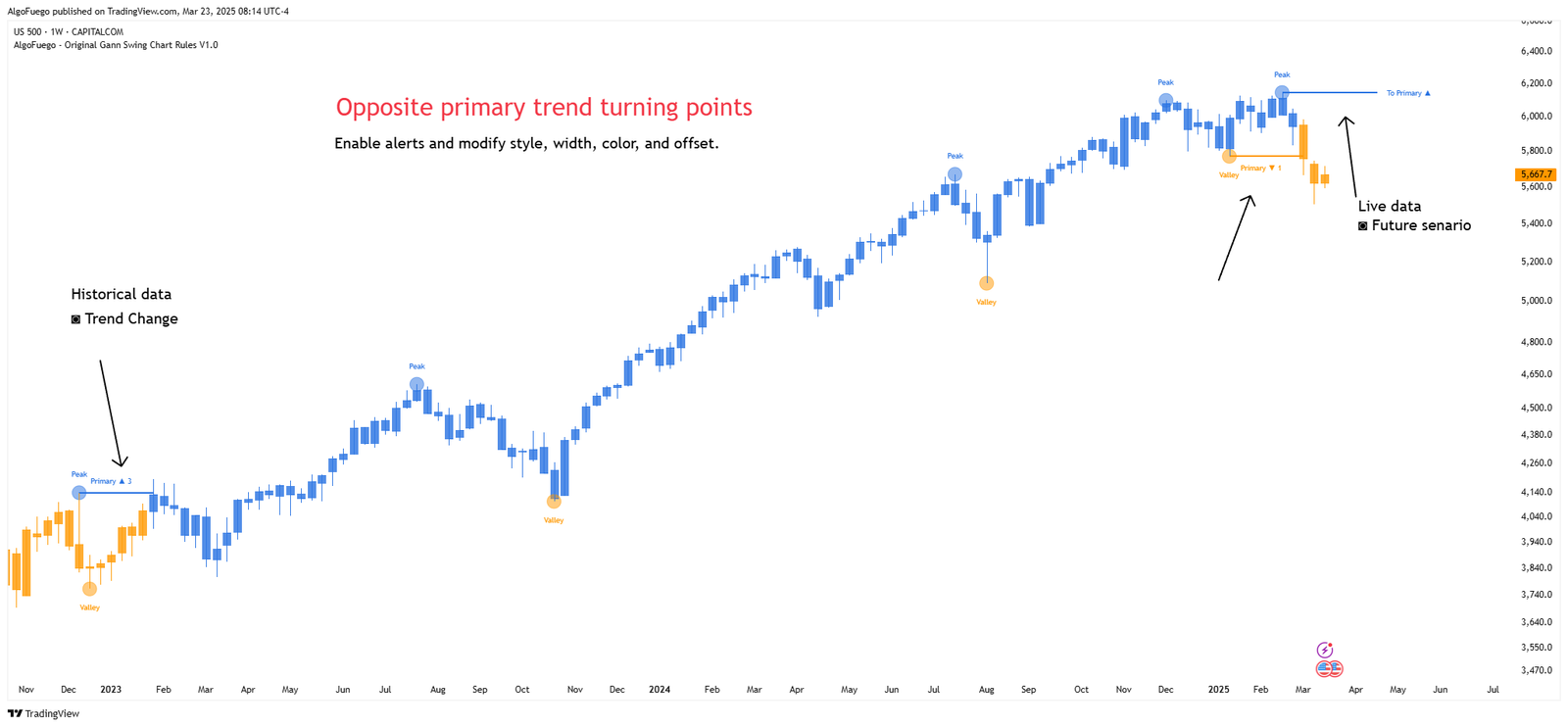 Toggle visibility of main trendlines, set alerts for peaks, valleys, and turning points, and customize line styles, colors, slopes, and marker appearance.