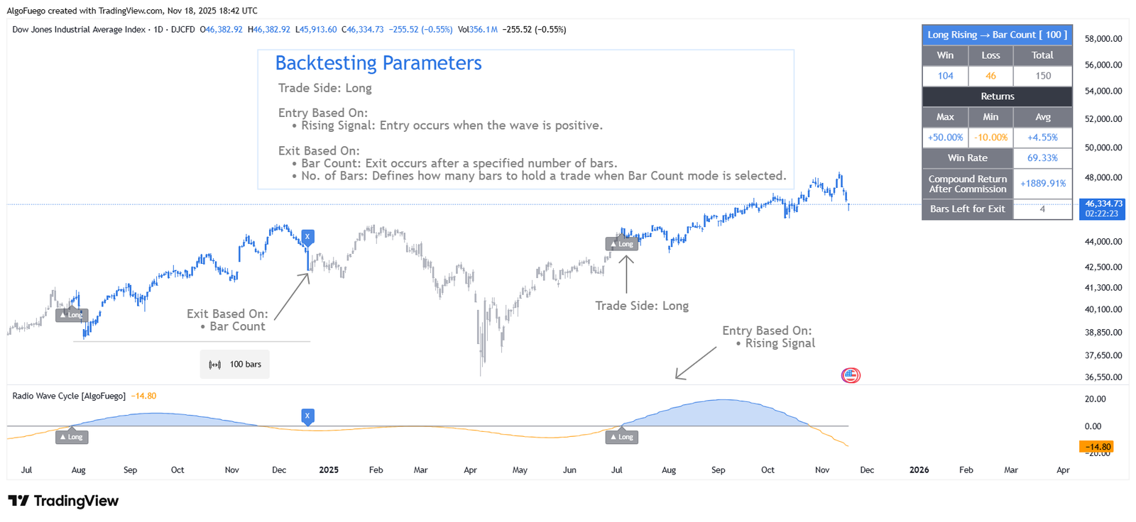Control how trades are entered and exited by selecting trade direction (Long or Short), entry signals (Rising or Falling wave), and exit logic (Wave reversal or fixed bar count).